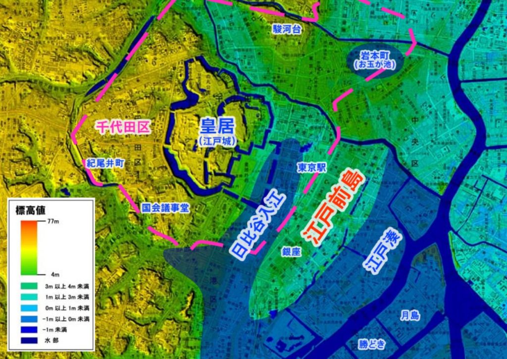1590年将軍_家康が岡崎城を出て江戸に入府してた時は中央区の半分以上は海中の中で、入江には島々が点在し、葦や葦が生い茂る田舎の荒れ地でした。1603年、東京駅と皇居間の日比谷入江と、隅田川沿い一帯を埋め立て、交通の中心となる隅田川からの支流河川、運河が開拓されます。