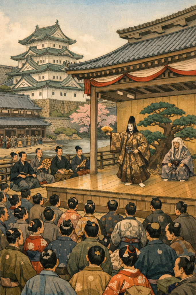 Following in the footsteps of Toyotomi Hideyoshi, who had patronized the four Yamato Saruwaka schools (Konbaru, Kongo, Hosho, and Kanze), the Edo Shogunate designated these four schools—along with the Kita school—as the official performing arts of the shogunate. On auspicious occasions such as the shogun’s proclamation, weddings, coming-of-age ceremonies, and the birth of a young lord, Nogaku dances were performed on the stage in front of the main hall of the Honmaru Palace.